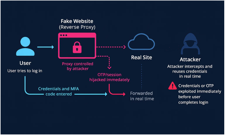 Reverse proxy phishing attacks allow cybercriminals to hijack login sessions in real time by intercepting credentials and MFA codes through a proxy server that relays traffic between the victim and the real site.